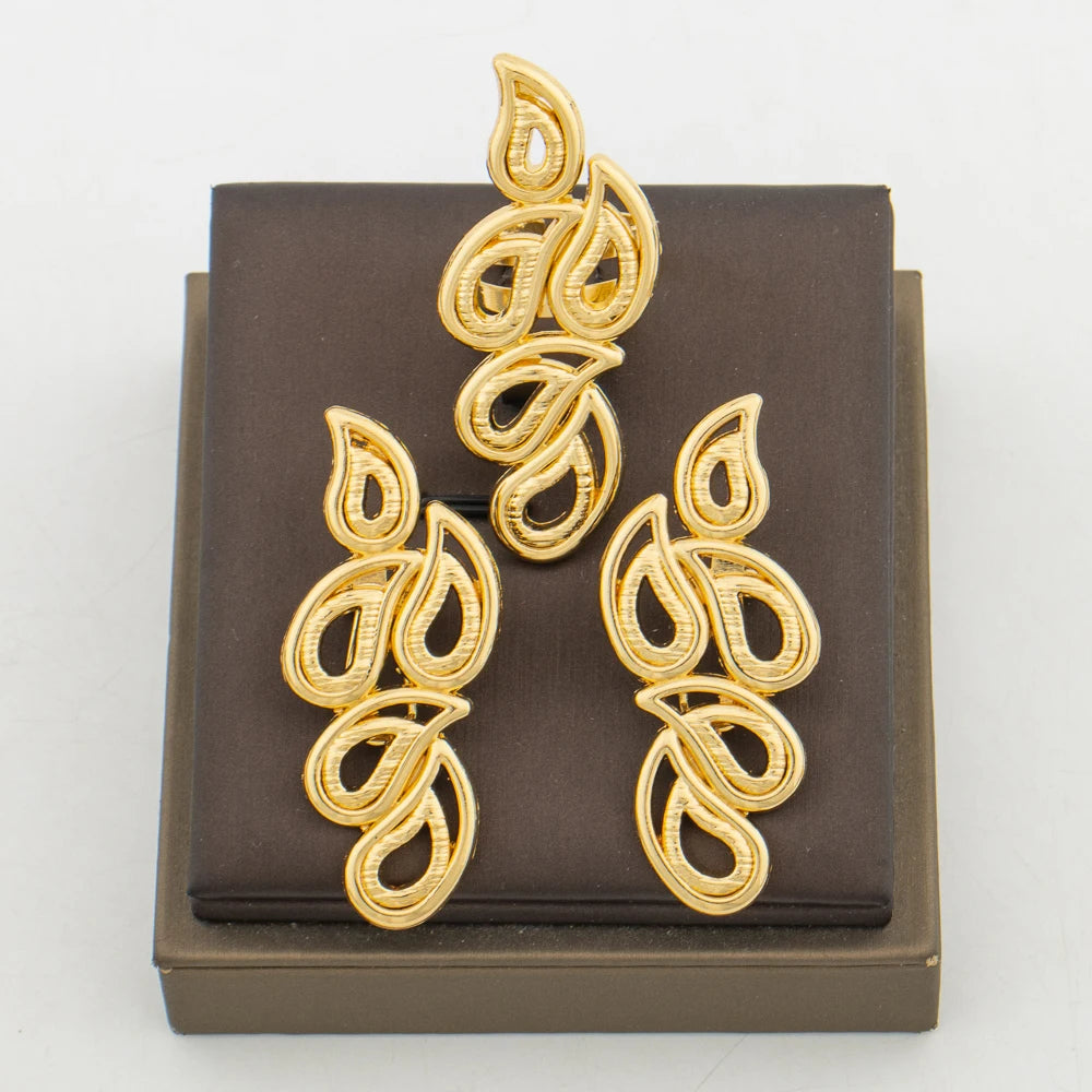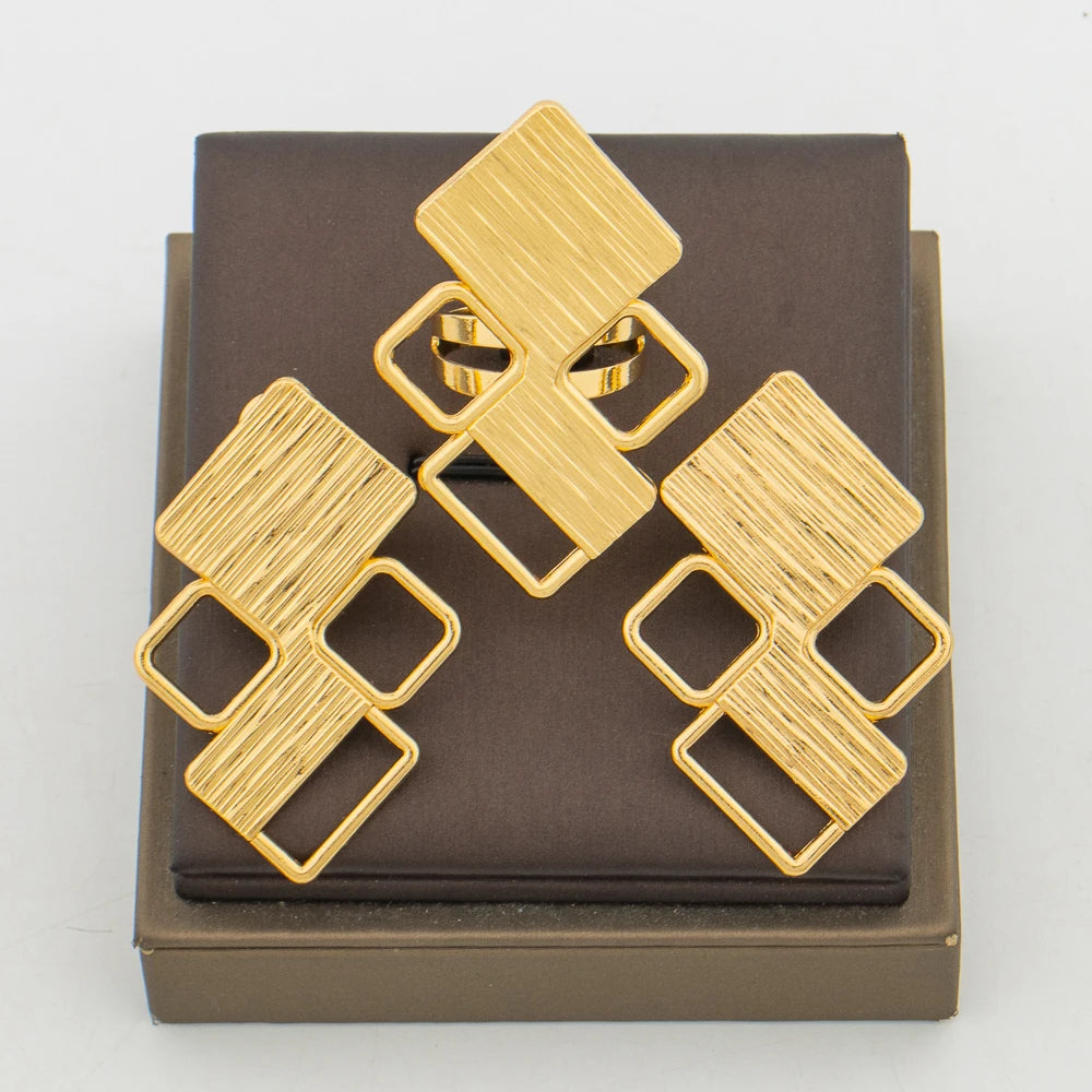 18k Gold Color Earrings with Ring Jewelry Set for Bridal African Clip Earrings and Finger Ring 2Pcs Set for Engagement Jewellery