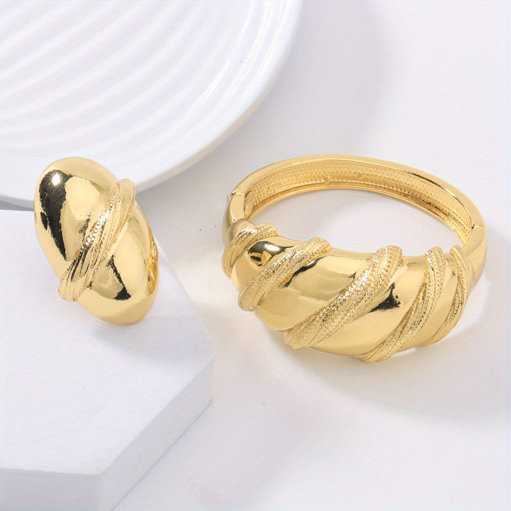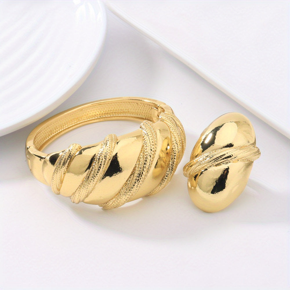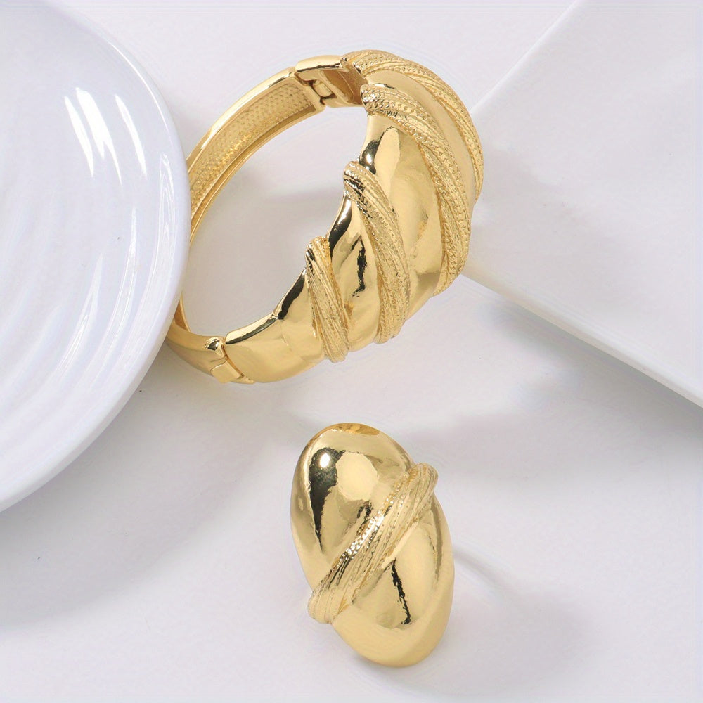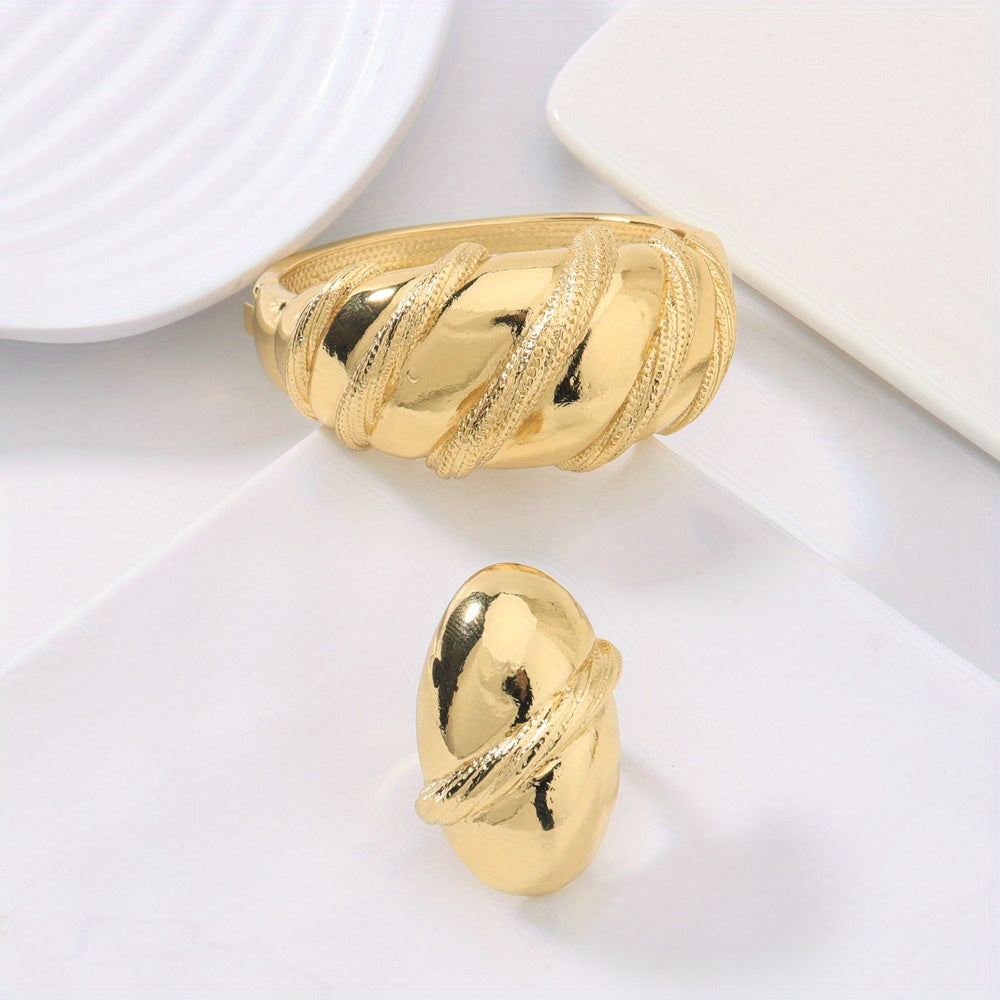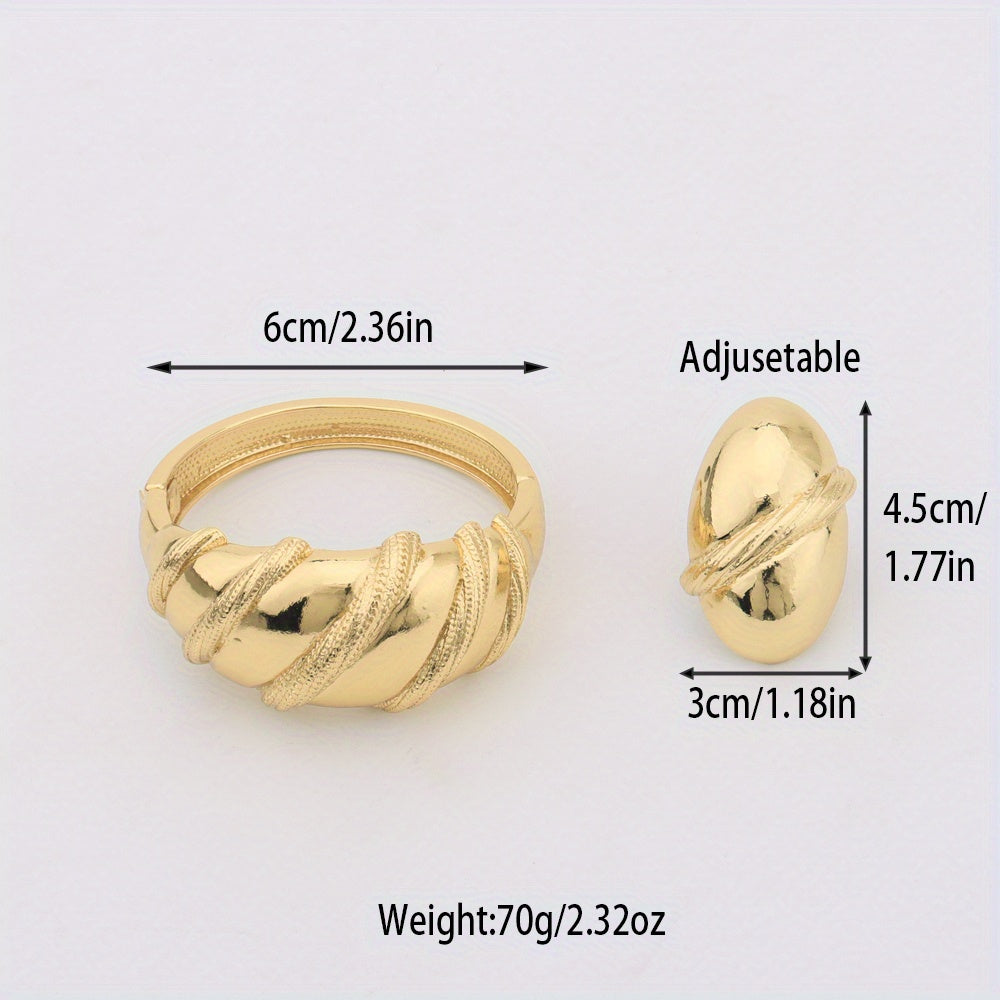 2pcs 24k Golden Plated Chunky Women's Copper Alloy Bracelet Ring Set, Perfect for Wedding Wear/Mother's Day/Valentine's Day/Gift Giving/Gift for Mother/Elegant/Middle Eastern Gift/African Congolese Fashion, Old Money Style