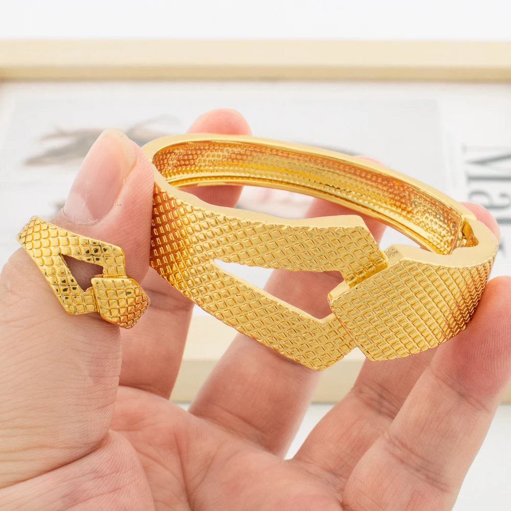 African Gold Color Bangle with Ring Jewelry Set for Party Hollow Out Design Hand Bracelet Cocktail Ring 2Pcs Set for Engagement