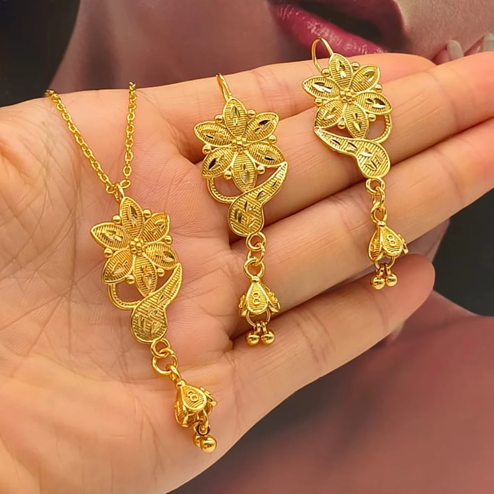 African Gold Color Jewelry Set for Party Elegant Hollow Out Design Drop Earrings and Necklace 2Pcs Set for Engagement Party Gift
