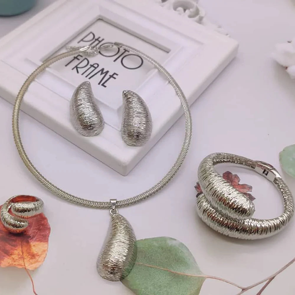 African Jewelry Set for Women Copper Alloy Earrings and Pendant Necklace Bangle Ring Set for Nigerian Daily Wear Party Gift