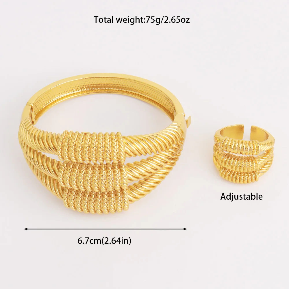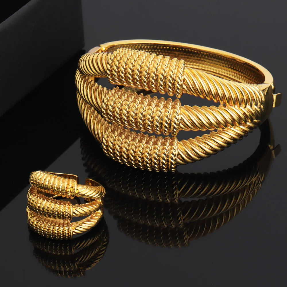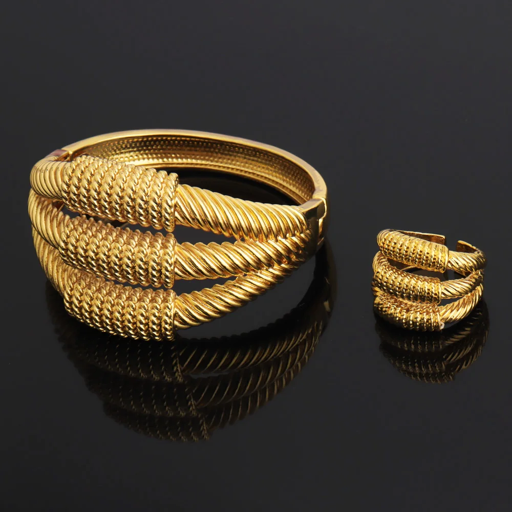 Bangle with Ring Jewelry Set for Party African 18k Gold Color Hand Bracelet Cocktail Ring 2Pcs Set for Engagement Jewelry Gifts