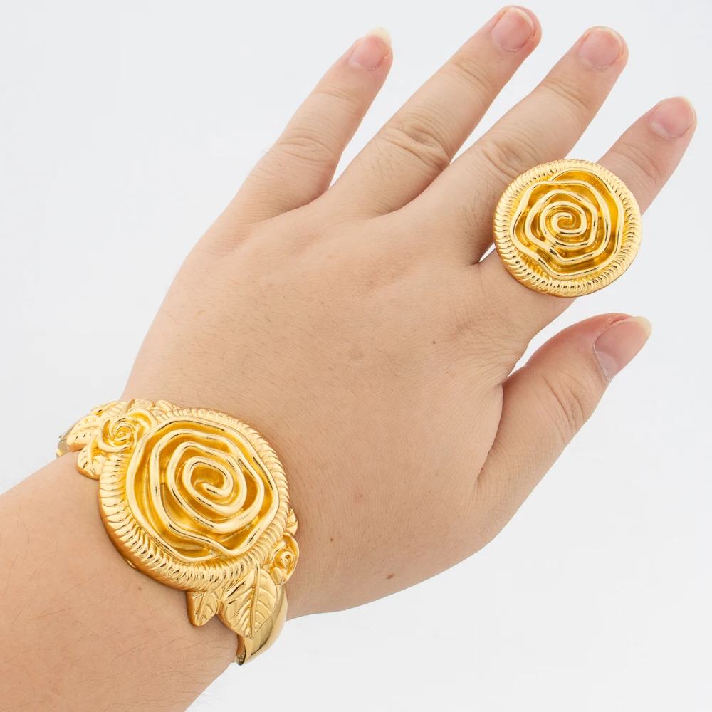 Brazilian Gold Plated Bangle with Ring Jewelry for Ladies Exquisite Flower Design Hand Bracelet Finger Ring 2Pcs Set for Party