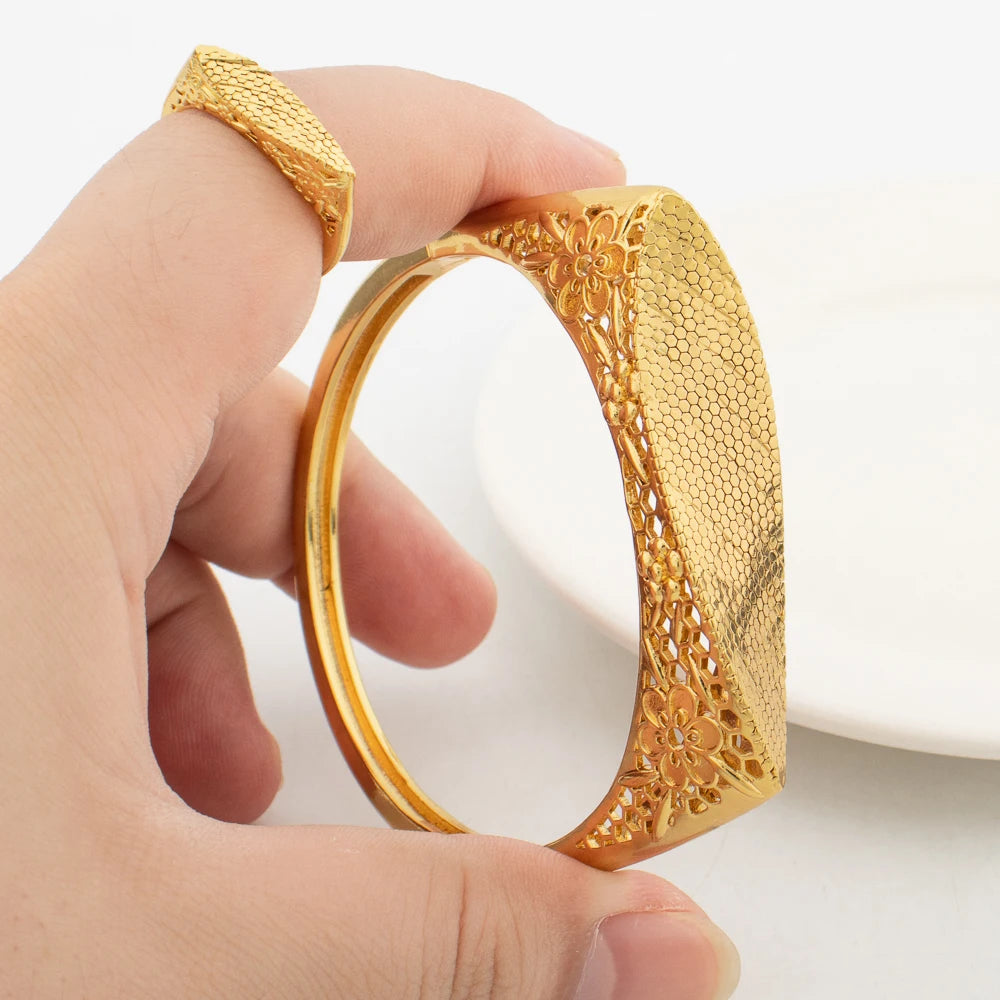 Charm Bracelets with Rings Dubai Wedding Bride Jewelry 18K Gold Plated Fashion Bangles for Women Open Ring Party Weddings Gifts