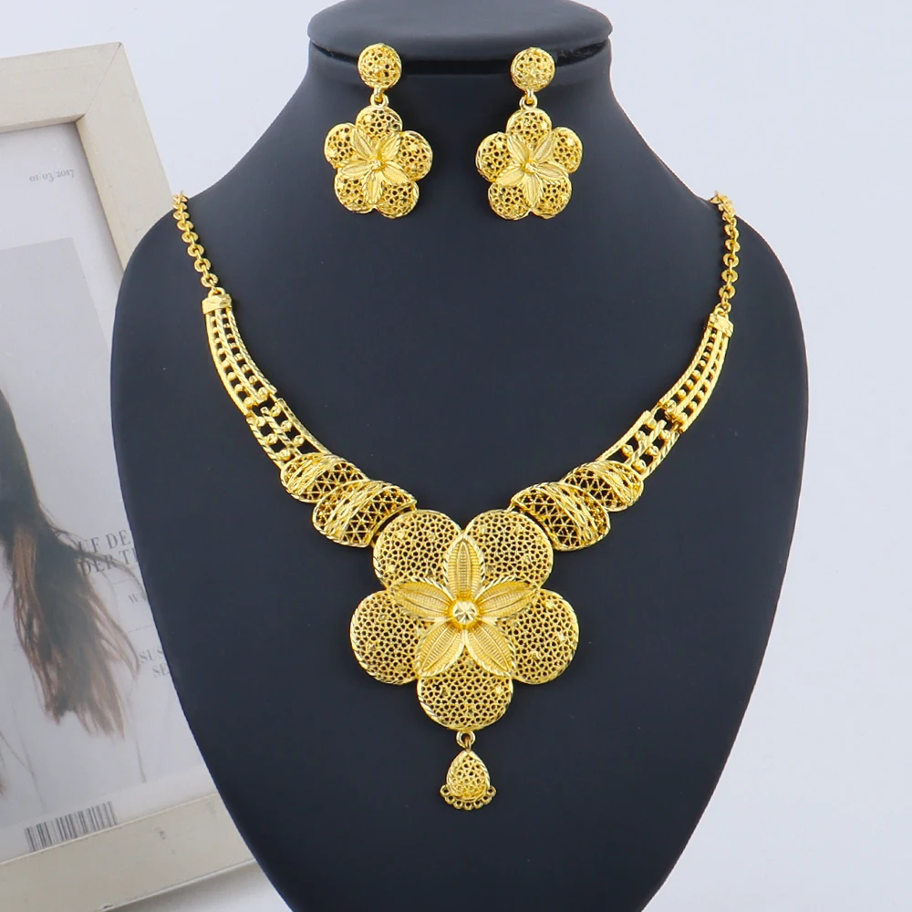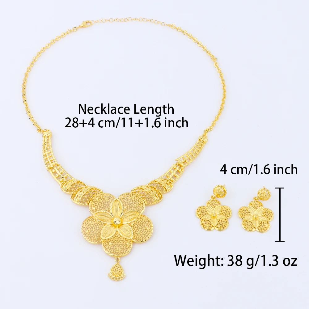 Dubai African 24K Gold Plated Flower Necklace Earrings Set for Women Gold Color Party Wedding Banquet Jewelry Jeweler Gift