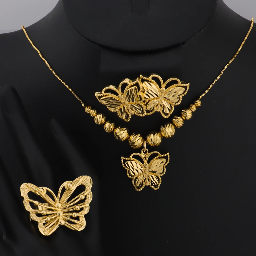 Dubai Gold Color Butterfly Necklace Earrings Ring Personalized Jewelry Set For Family Daily Wear Wedding valentine day gift