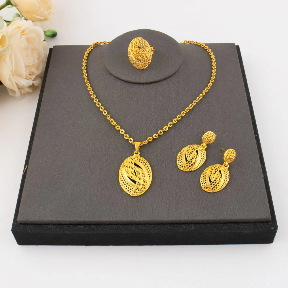Dubai gold-tone flower jewelry set: necklace, earrings & ring for women, elegant gift for couples, Christmas party sparkle, boxe