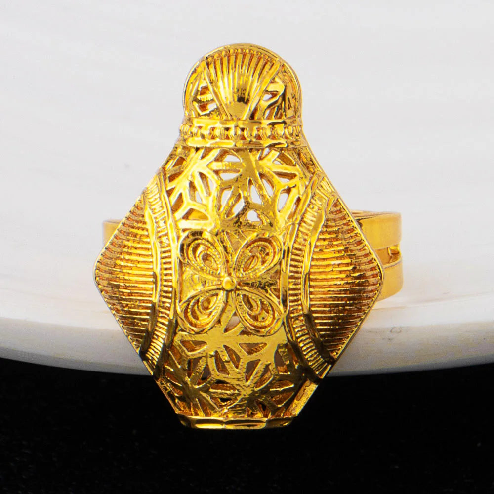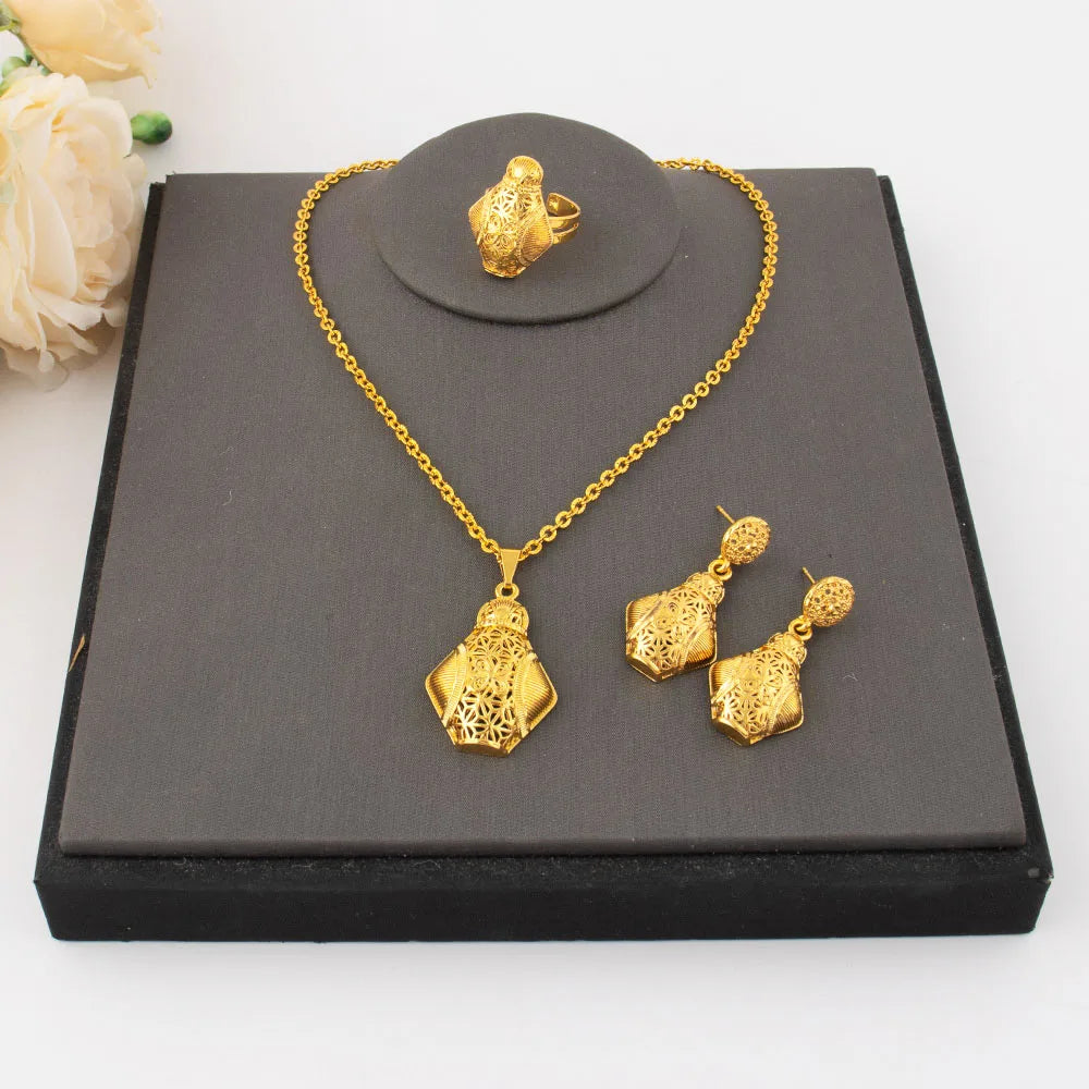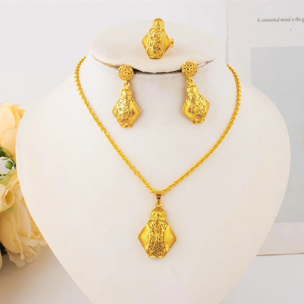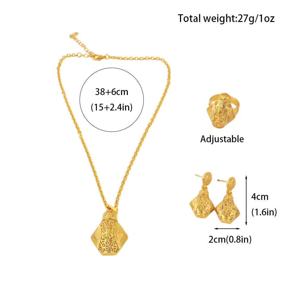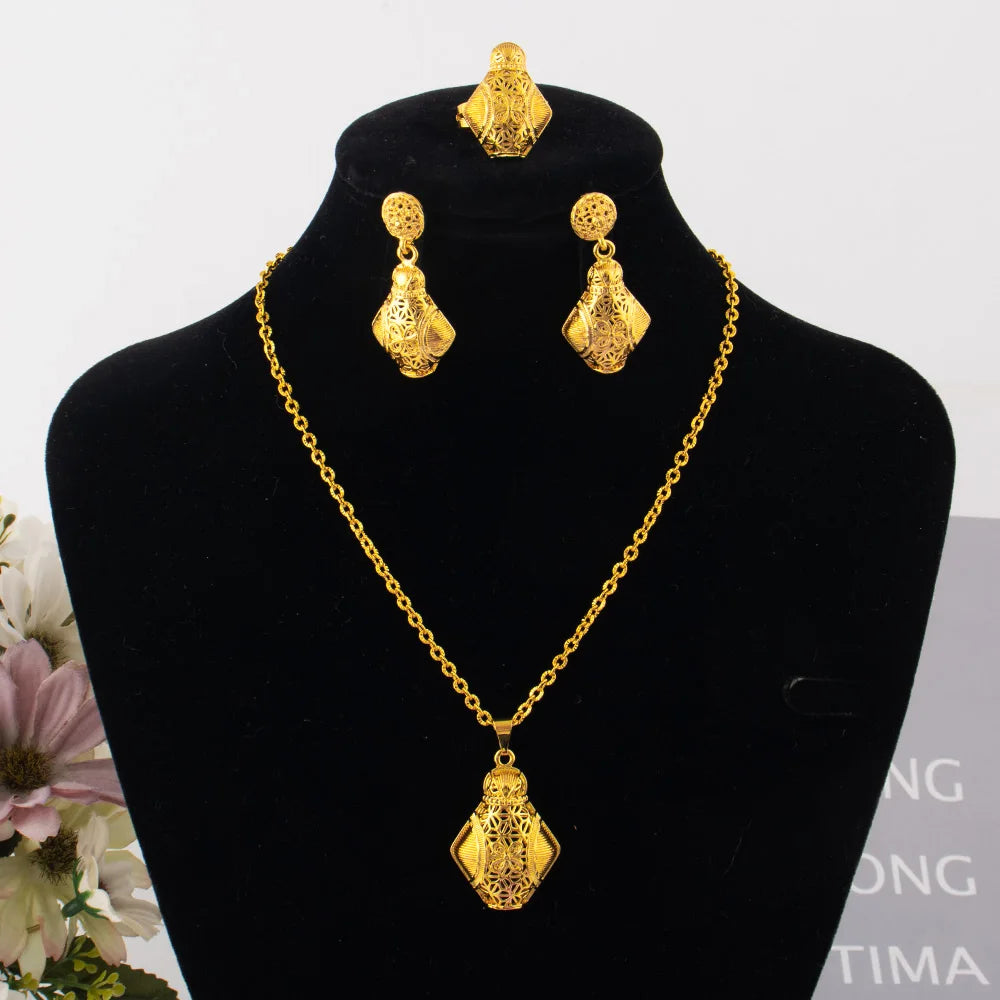 Dubai Gold-Tone Necklace & Earring Ring Set for Women, Classic African Party Jewelry Gift, Bridal Wedding Accessories