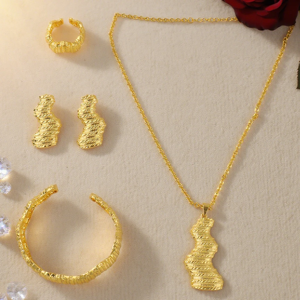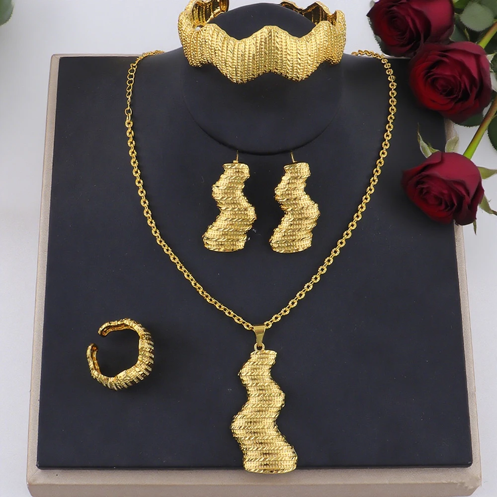Dubai Trendy Gold Plated Woman Jewelry Sets Hight Quality Necklace Earrings Stainless Steel Bangle Ring Sets Bridal Accessories