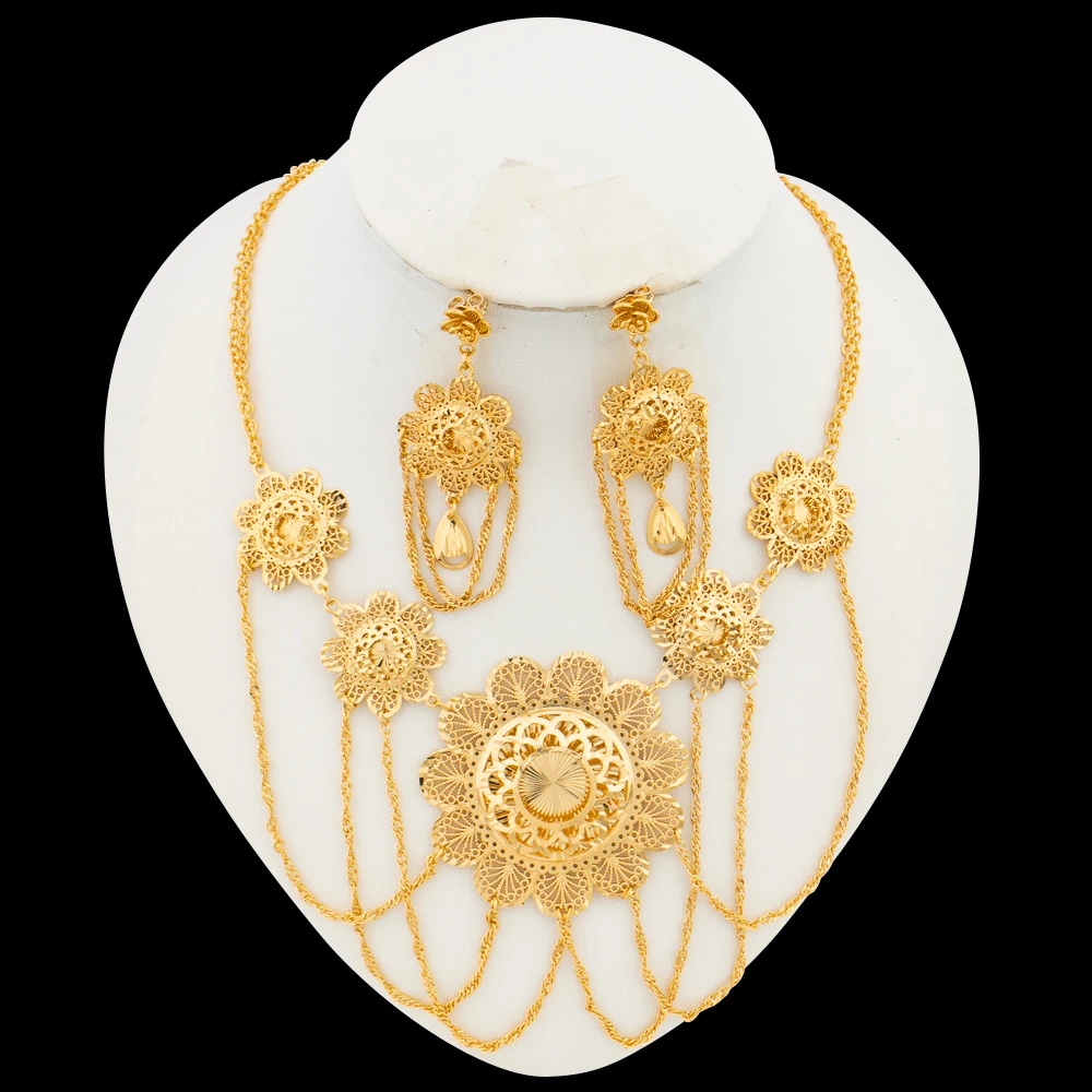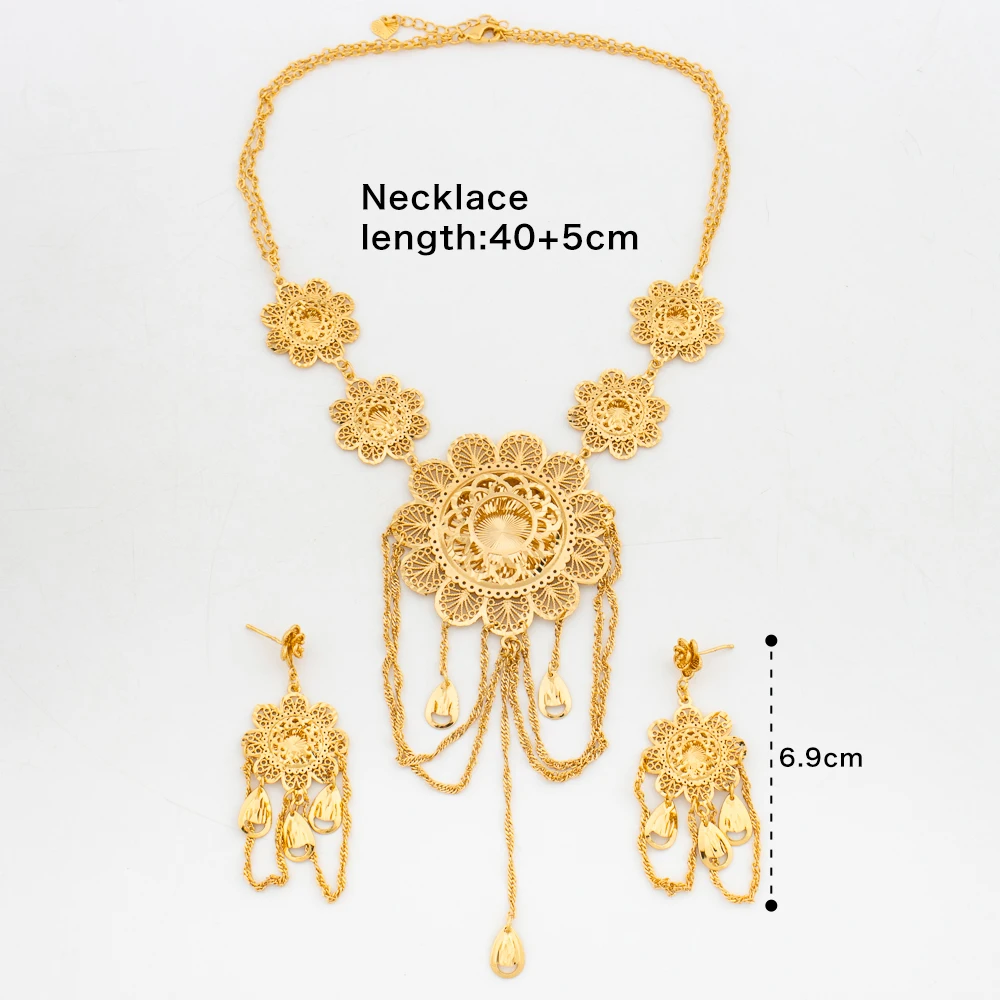 Ethiopian Earrings with Necklace Jewelry Set for Party 18k Gold Color Dangle Earrings Luxury Necklace Bride Set for Engagement