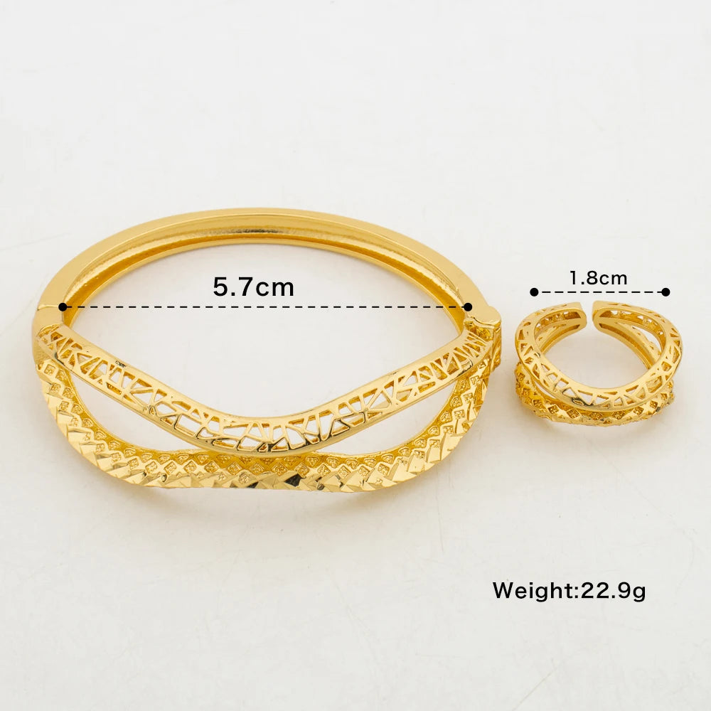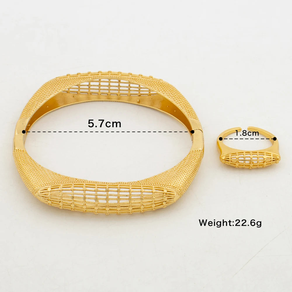 Ethiopian Gold Color Bangle Jewelry Set for Party Ladies Retro Design Hand Bracelet and Cocktail Ring 2Pcs Set for Brazilian