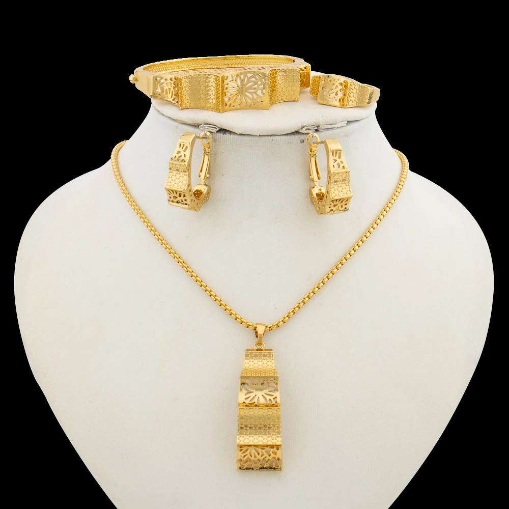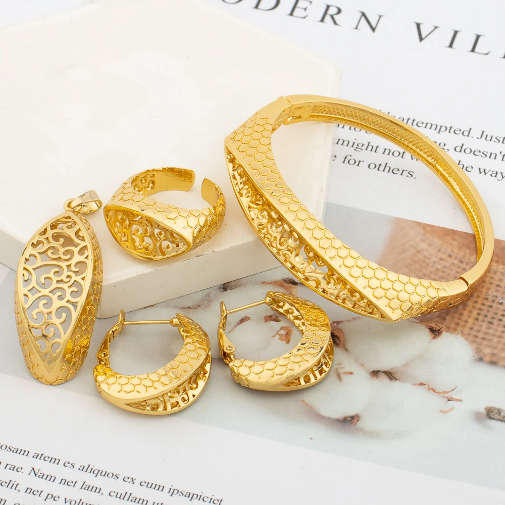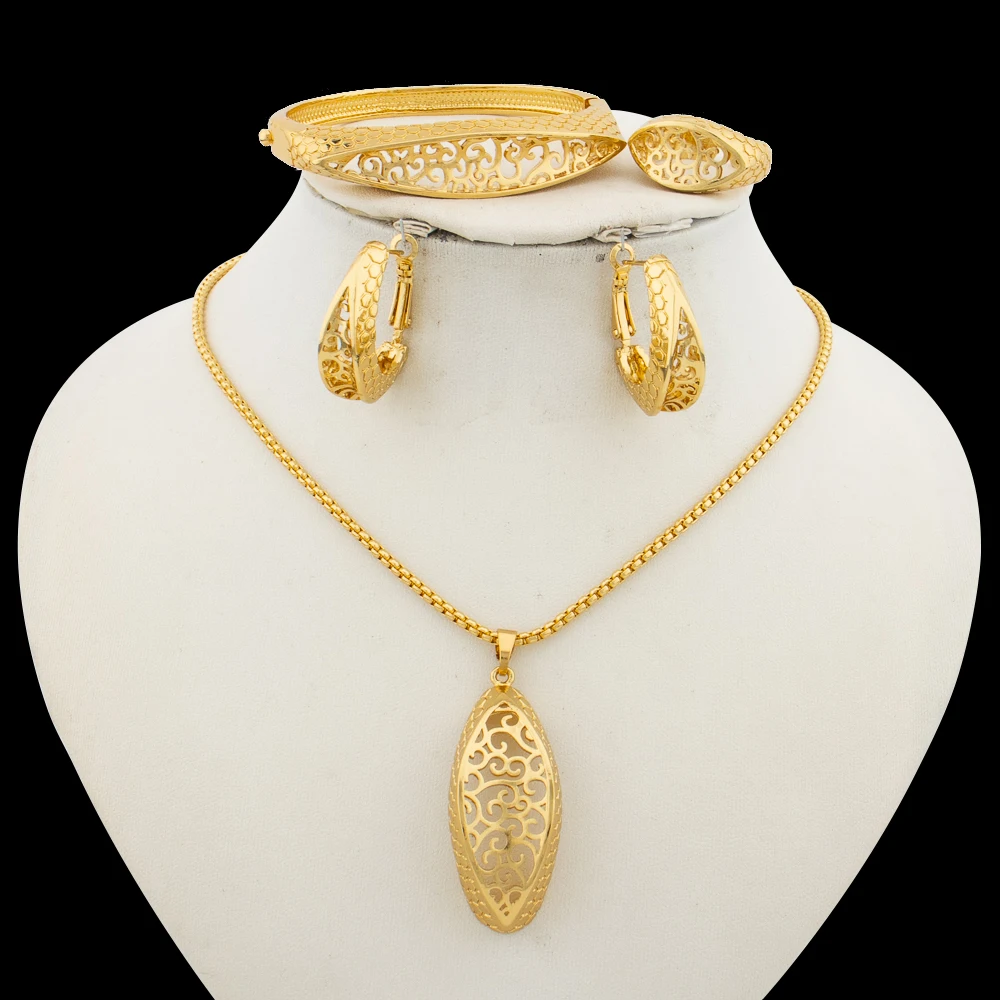 Ethiopian Gold Color Jewelry Set for Women Hollow Out Design Copper Necklace and Earrings Bracelet Ring Set for Engagement Gifts