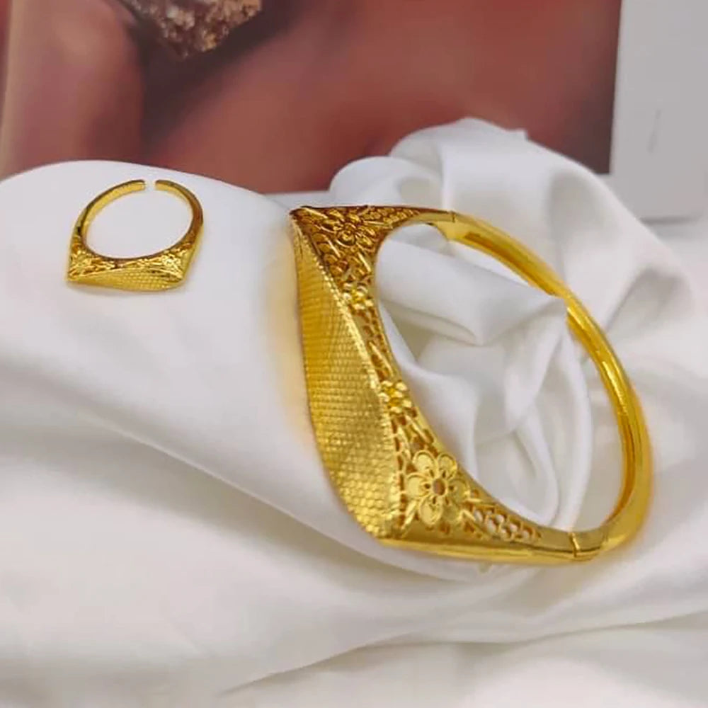 Geometry Design Bangle with Ring Set for Ladies African 18k Gold Color Hand Bracelet Cocktail Ring 2Pcs Set for Engagement Gifts