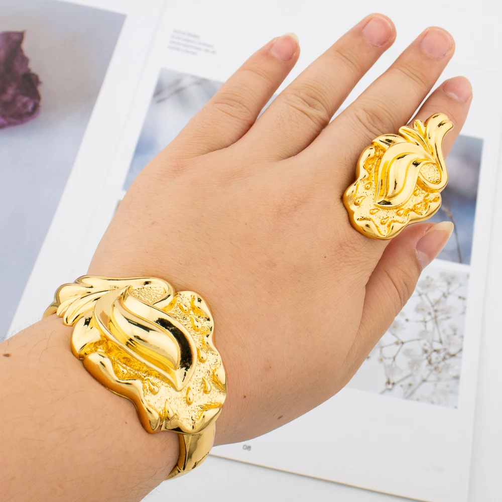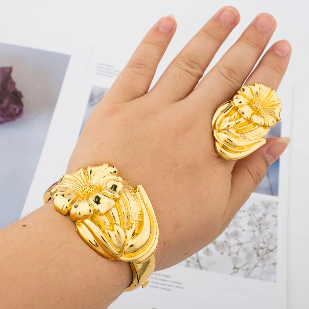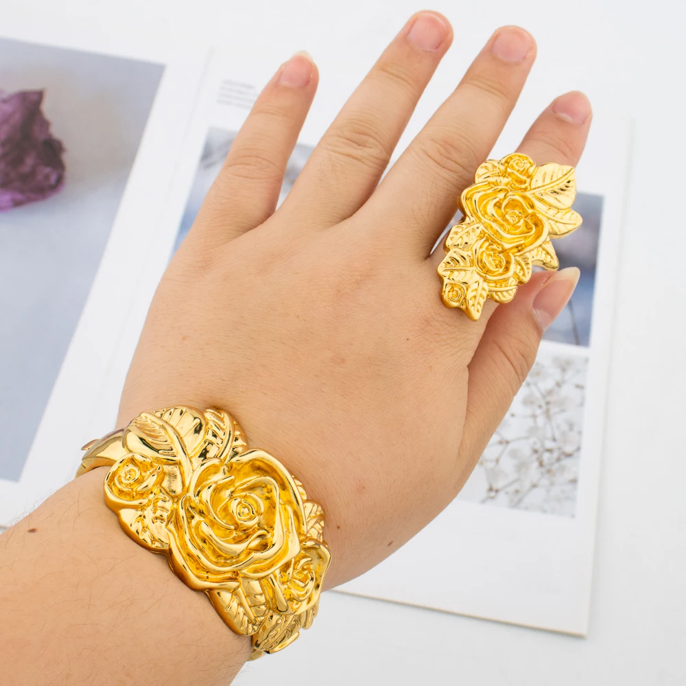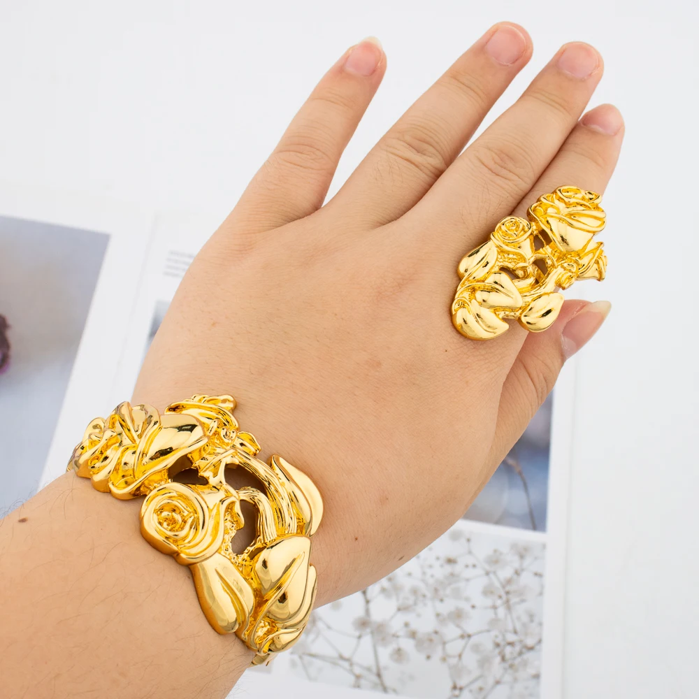 Gold Plated Bangle and Ring Set Fashion Romantic Rose Design Hollow Bracelet 18k Gold Color Jewelry Accessorie for Weddings