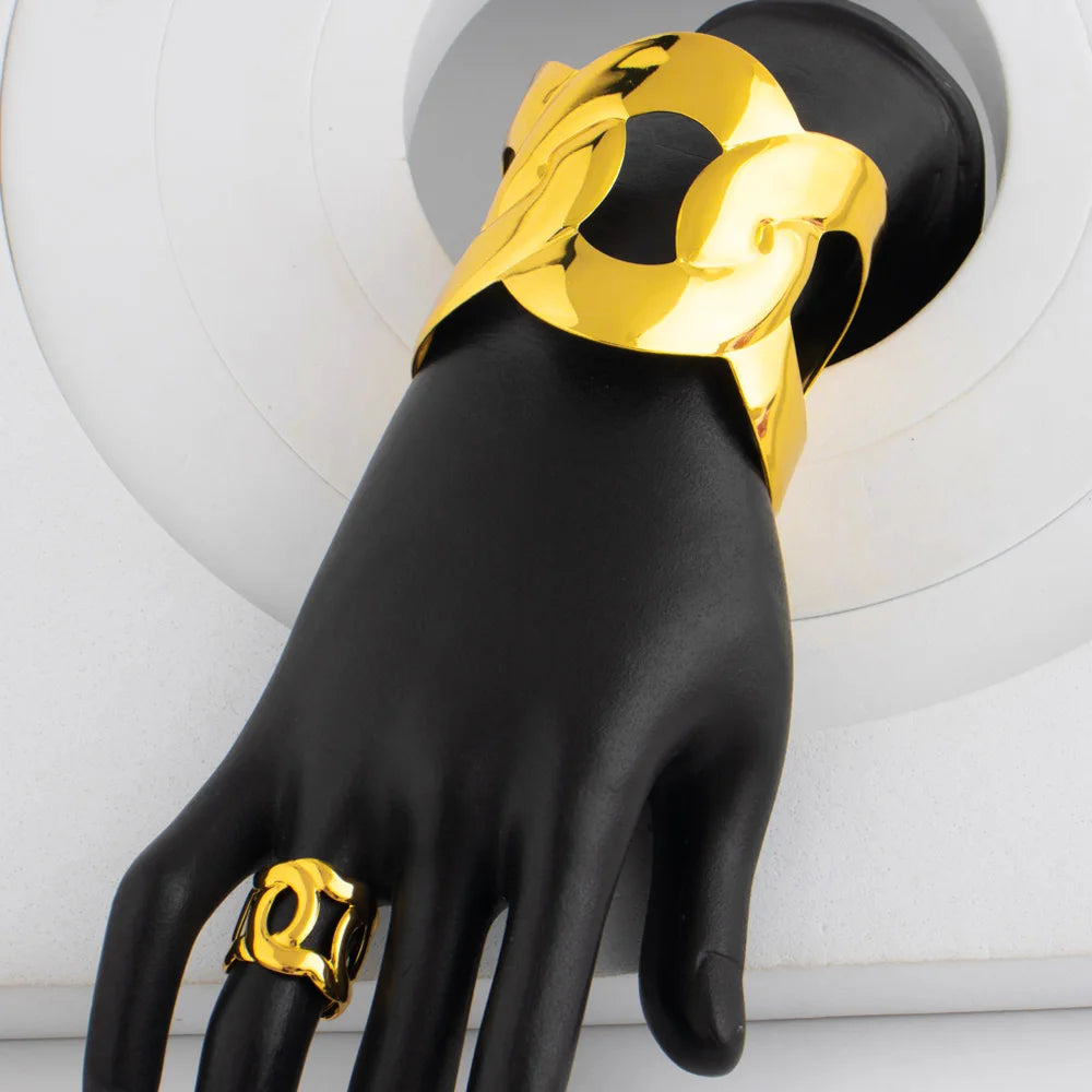 Indian Gold Color Bracelets with Ring for Women Luxury Trendy Female Dubai Circle Big Jewelry Set design Exaggerated Party Gift