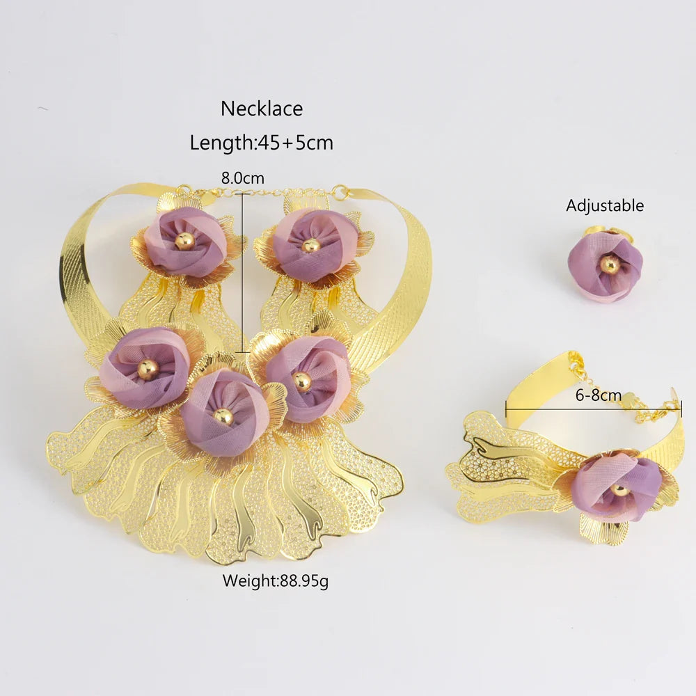 Gold Plated Jewelry Brazil Purple Satin Flower Necklace Earring for Women All Copper Luxury Party Dinner Lady Bracelet Ring Gift
